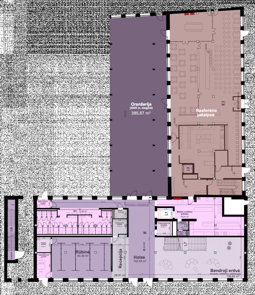 Unikali erdvė - 7m aukščio, 75 metų medinės lubos, be kolonų.